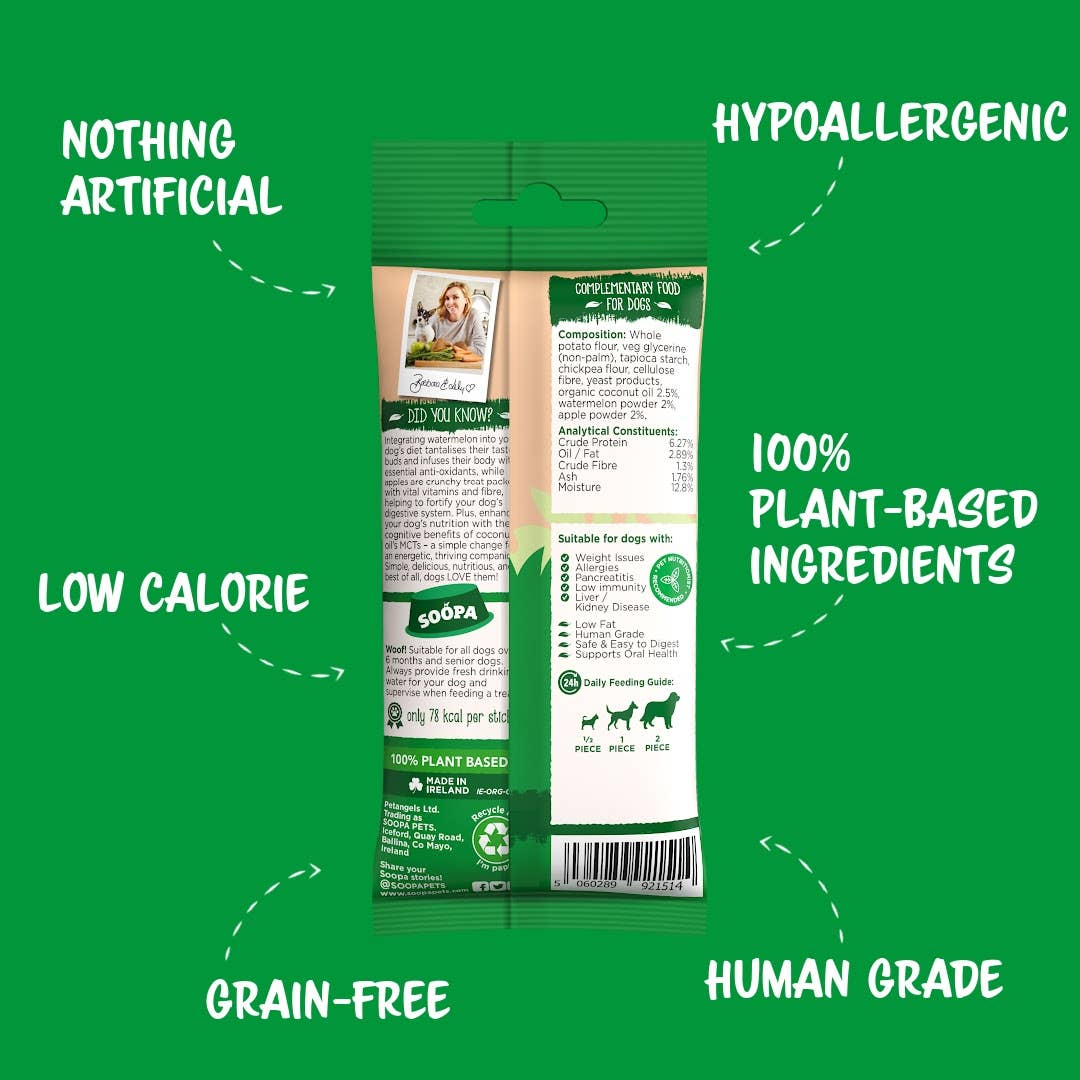 Les bâtonnets dentaires Soopa sont une friandise hypoallergénique sans céréales pour le chien qui adore mâcher.