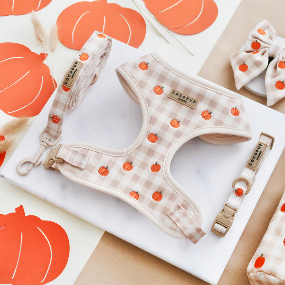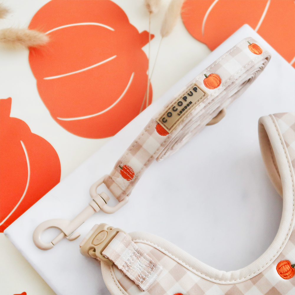 Ajoutez une touche de plaisir automnal à vos promenades quotidiennes avec la laisse Pumpkin Patch. Arborant un motif vichy nude orné de citrouilles brodées, cette laisse apporte une ambiance ludique et cosy à chaque sortie. Parfait pour célébrer la saison tout en gardant votre chien élégant et en sécurité.
